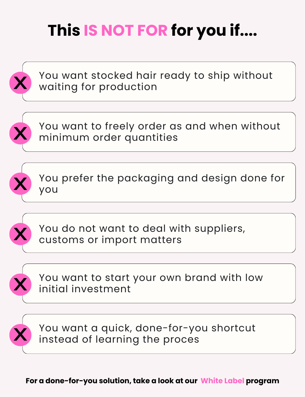 This program is best for those who have some hair extension experience or ready to commit to building a long-term brand. If you’re brand new or unsure, my White Label Program might be a better fit to start with.